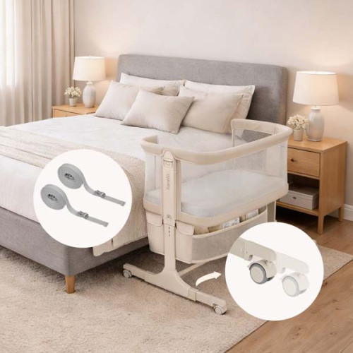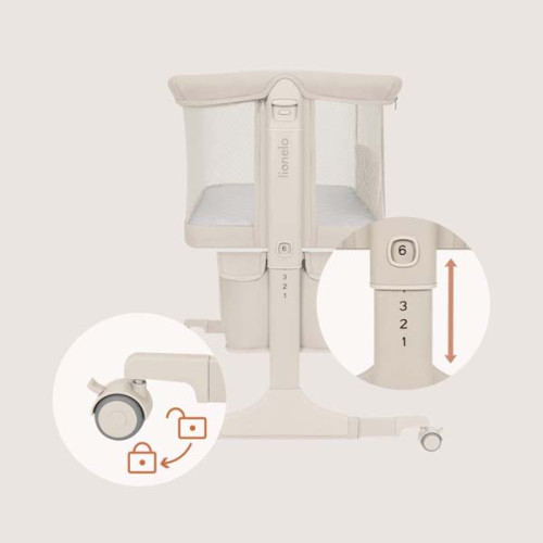 Функция приставной кроватки позволяет малышу быть рядом с мамой, что значительно облегчает ночное кормление. Благодаря шести уровням высоты и регулируемым ножкам, Lionelo Jodie идеально стыкуется даже с высокими континентальными кроватями, а специальные ремни гарантируют устойчивую фиксацию.