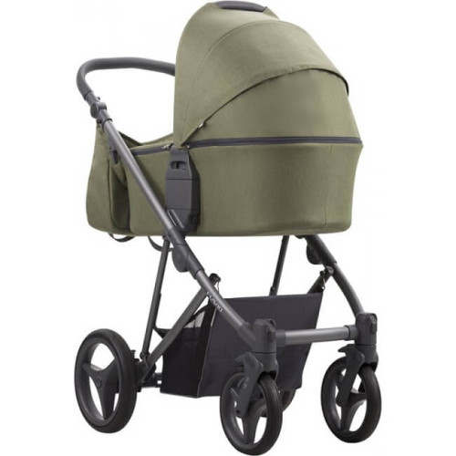 универсальную коляску 2 в 1 Bebetto Flavio 03. Модель представлена в цвете хаки. Ее особенности включают двухуровневую люльку со съемкой по