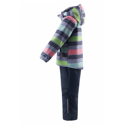 Данная модель представлена в красочной расцветке - розово-серая с салатовой окраской в полоску куртка и однотонные темно-синие штаны.