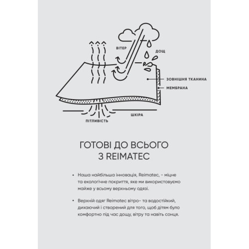 • Полная совместимость с многослойной одеждой Reima через систему кнопок Zip-in.